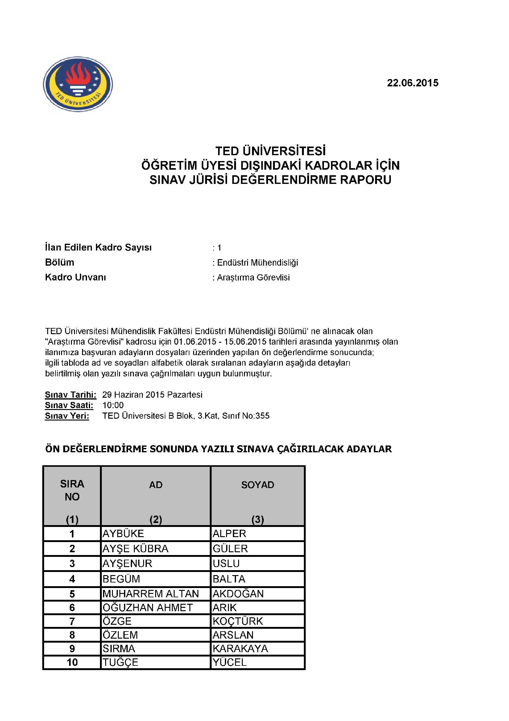 Endüstri Mühendisliği Bölümü Araştırma Görevlisi Ön Değerlendirme sonuçlarını jpeg formatında görmek için tıklayınız.