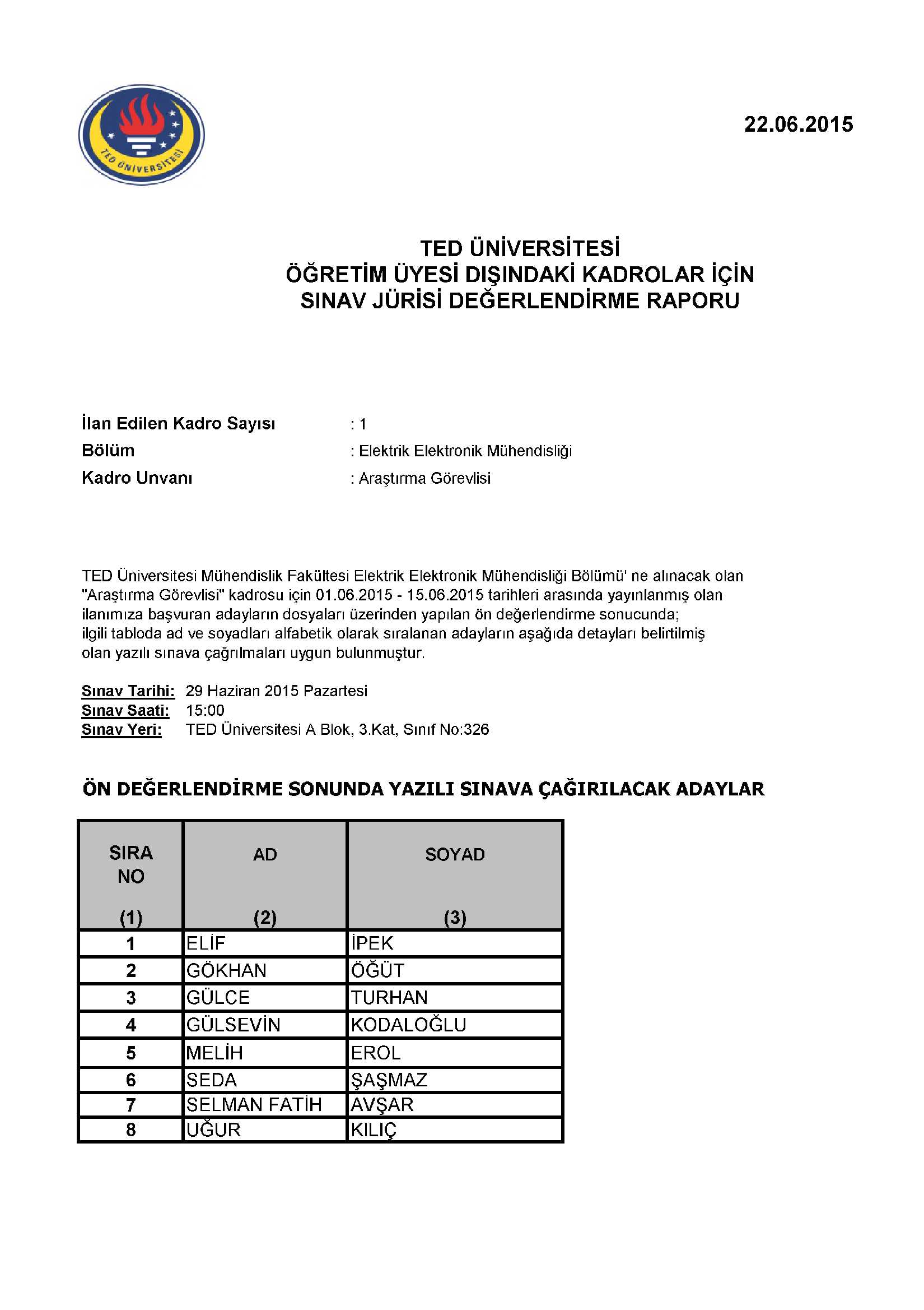 Elektrik-Elektronik Müh. Bölümü Araştırma Görevlileri Ön Değerlendirme Sonuçlarını jpeg formatında görmek için tıklayınız.