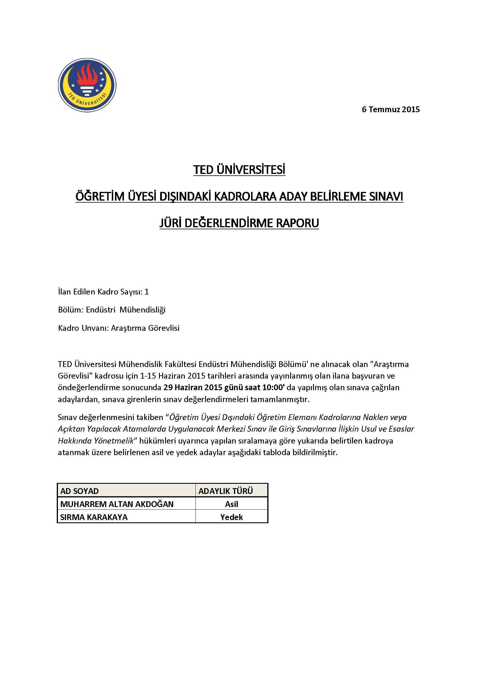 Endüstri Mühendisliği Bölümü Araştırma Görevlisi Sınav Sonuçları