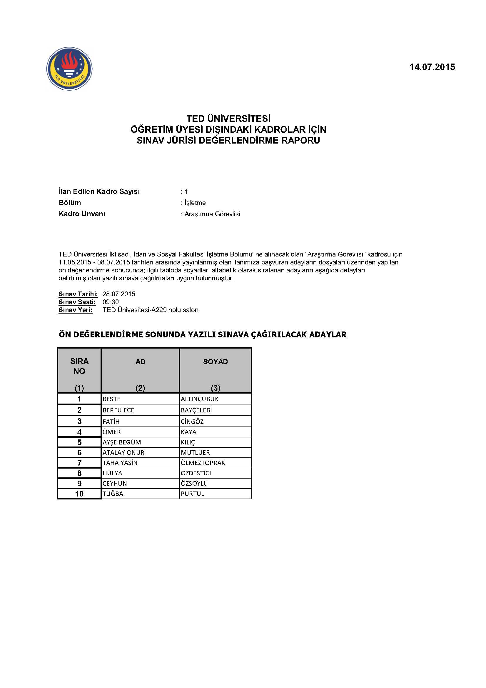 İİSBF - İŞLETME BÖLÜMÜ ARAŞTIRMA GÖR. ÖN DEĞERLENDİRME SONUÇLARI